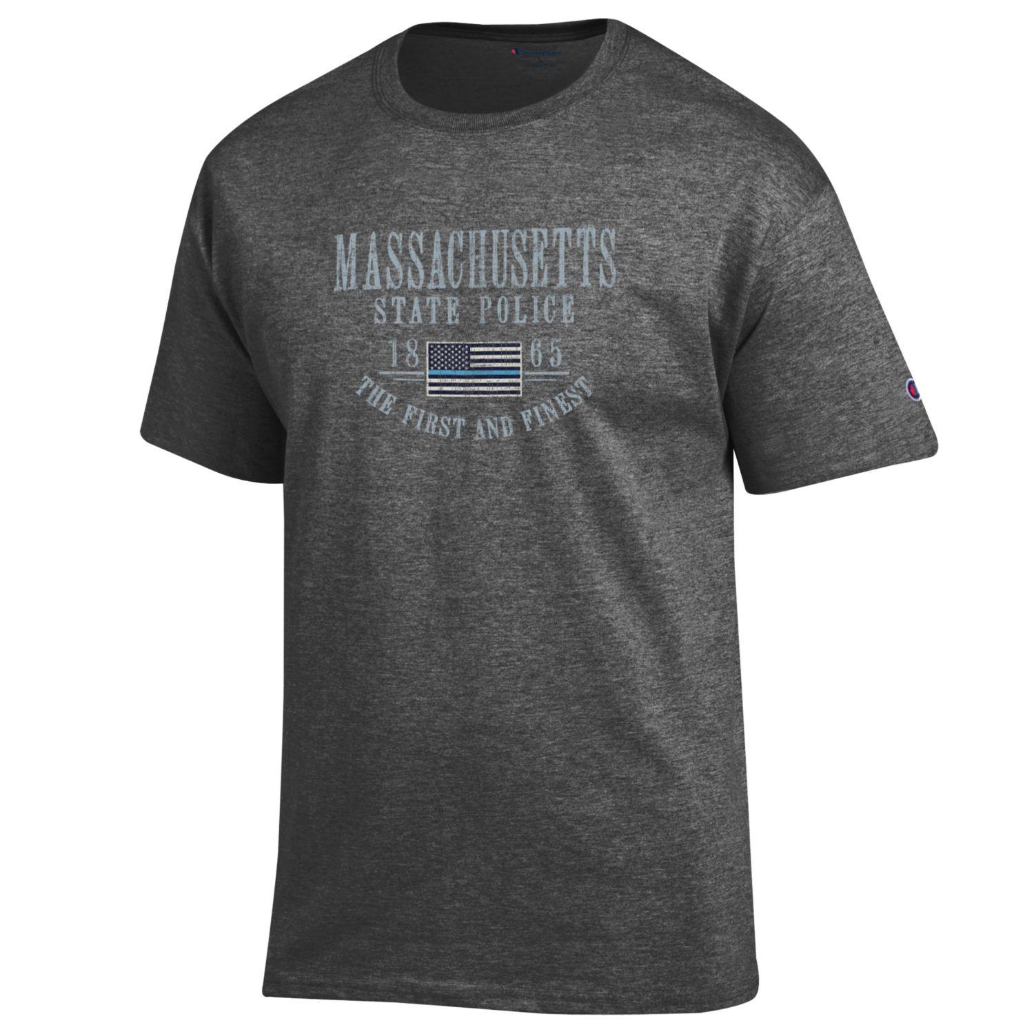 Champion Short Sleeve T-shirt, Logo: MSP Thin Blue Line Flag, Color: Dark Grey
